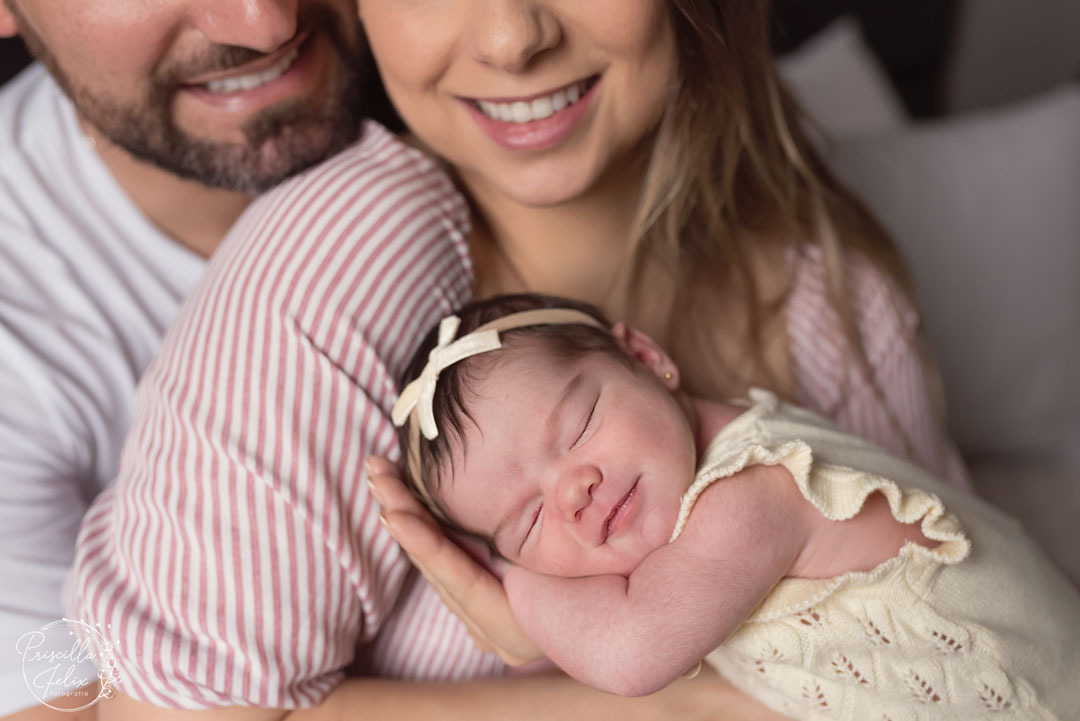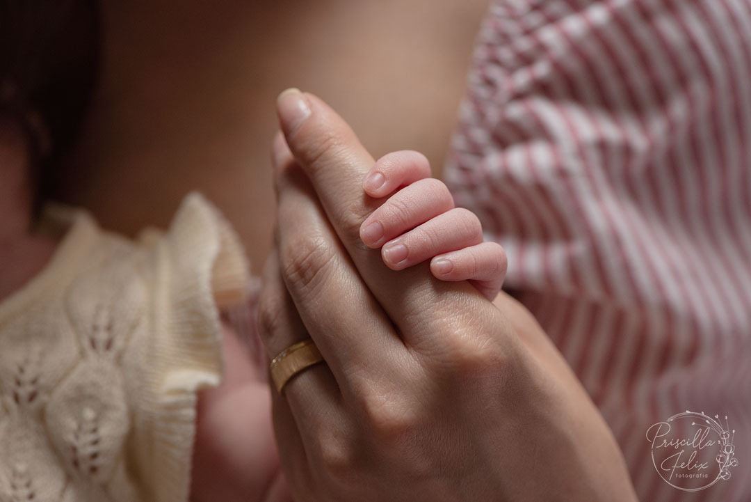 Todas as poses do newborn tradicional são feitas nesse ensaio, porém, usando as mãos do papai, da mamãe no lugar dos acessórios.